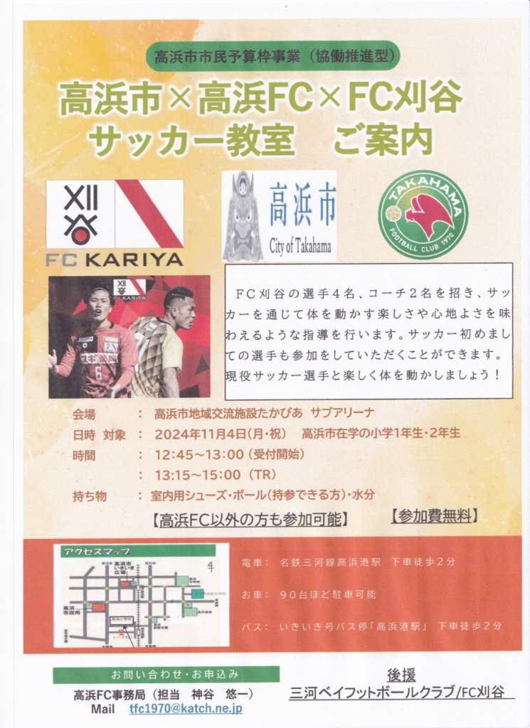 11月4日(月・祝)、高浜市市民予算枠事業として高浜市在学の小学1年生、2年生を対象にFC刈谷の選手、コーチにきていただいてサッカー教室を行います。