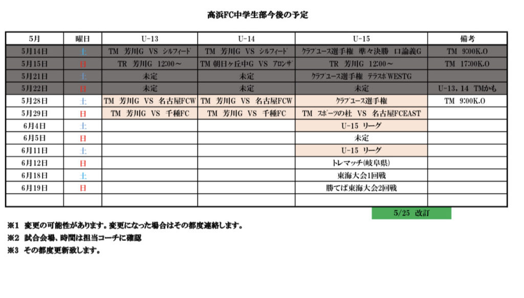 アカデミー観戦ガイド 中学生部予定 5月28日~