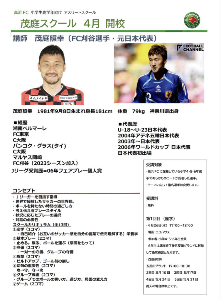 元日本代表 茂庭選手のスクール(小学高学年)開校いたします。