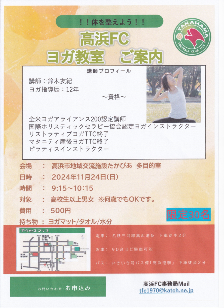 12月8日(日)、9時15分~10時15分、たかぴあ多目的でヨガ教室を開催します!!