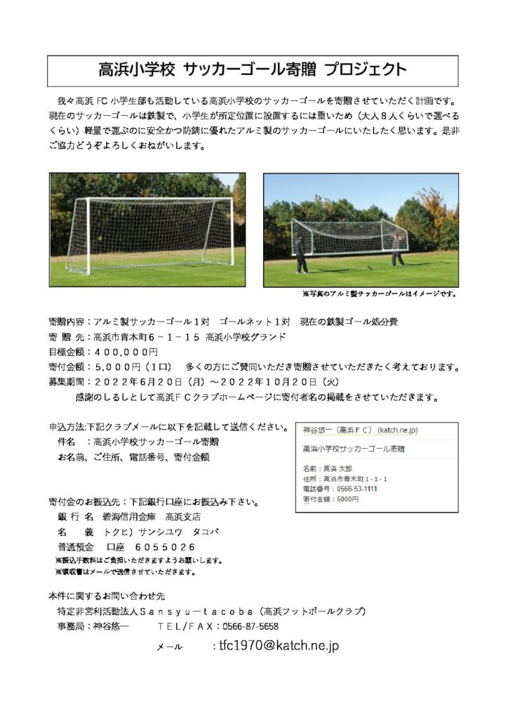 クラブ 高浜小学校サッカーゴール寄贈プロジェクト